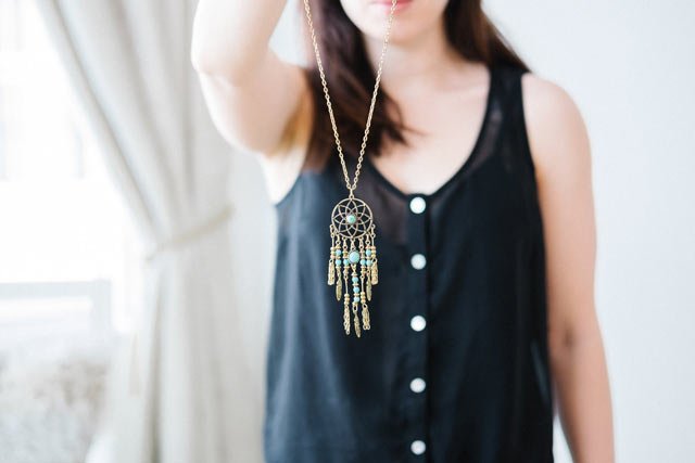 Long necklaces and layered chains do, however, work well with basic summer outfits like denim cut-offs and a plain tee. But make sure to take your neckline into account so that your necklace doesn’t hit your top in the wrong place and create a distraction.