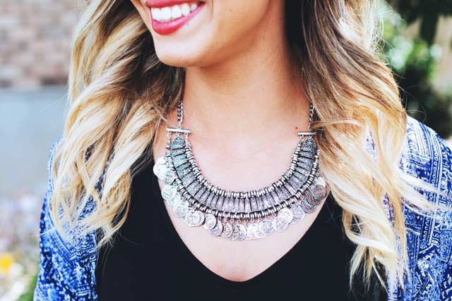 For example, a striped dress or an animal print romper won’t need much accessorizing. You should especially avoid wearing a long necklace over bold prints, ruffles, and other details, as this will look too busy. Instead, create harmony with a bold pair of earrings or a plain cuff.