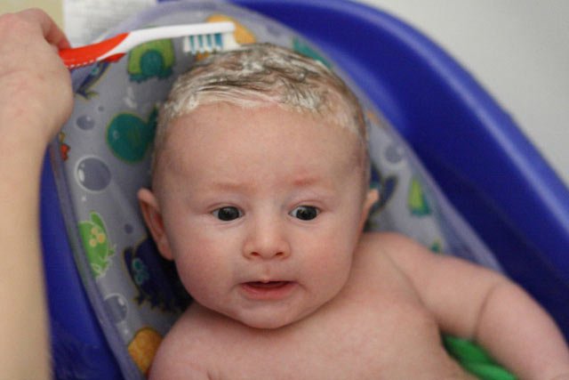 - Gentle brushing of a baby’s head can break down the scales and remove cradle cap patches. A soft brush with gentle bristles is key, not one with sharp or hard bristles. Be-careful do not to pick or scrape at the flakes not to irritate tender baby skin. Major retailers, including Bed, Bath & Beyond, and buybuyBABY, offer special brushes like the Bean-B-Clean brush that are both gentle and effective. Brush softly in one direction, removing flakes from the little strands of hair. This works with dry or wet hair.